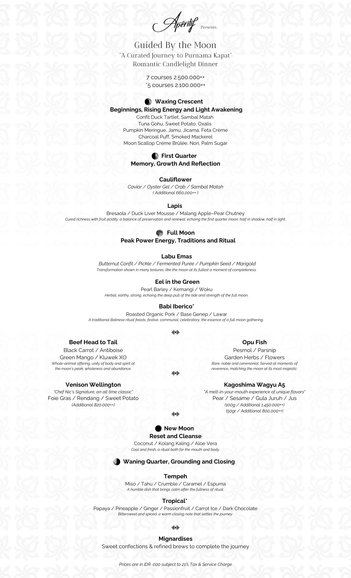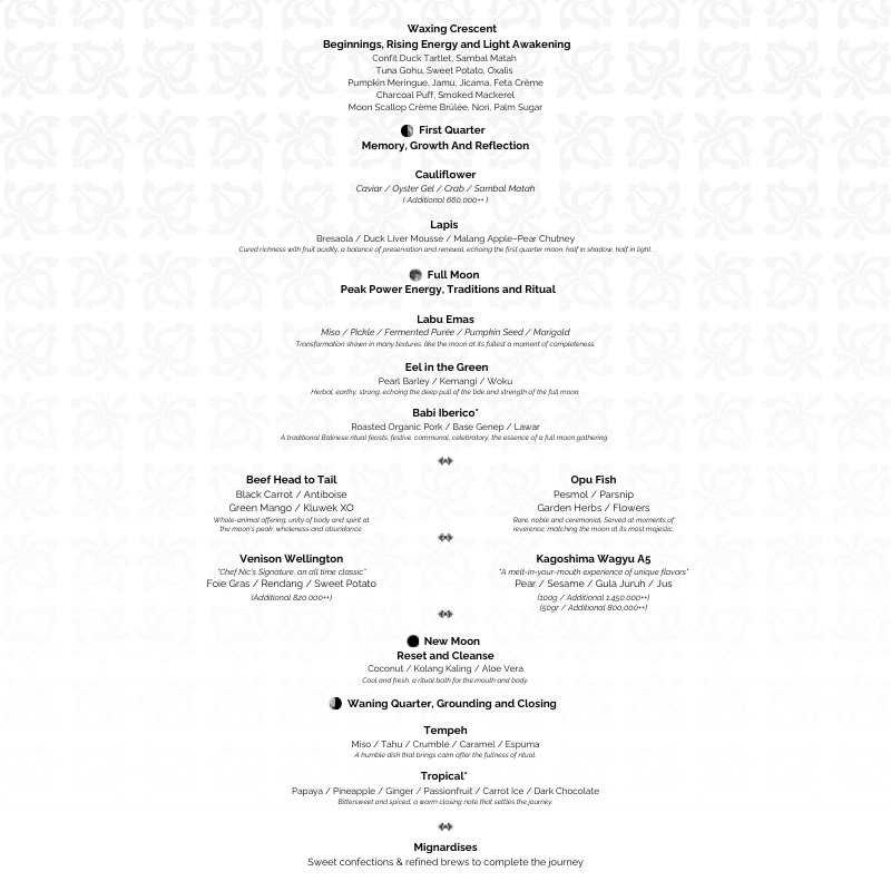 Guided by the rhythm of the Balinese lunar cycle, Apéritif’s menu evolves throughout the year, reflecting nature’s seasons and the continuous discovery of new ingredients. While the structure of the degustation remains elegant and cohesive, each visit offers subtle variations that make the experience feel new yet familiar.