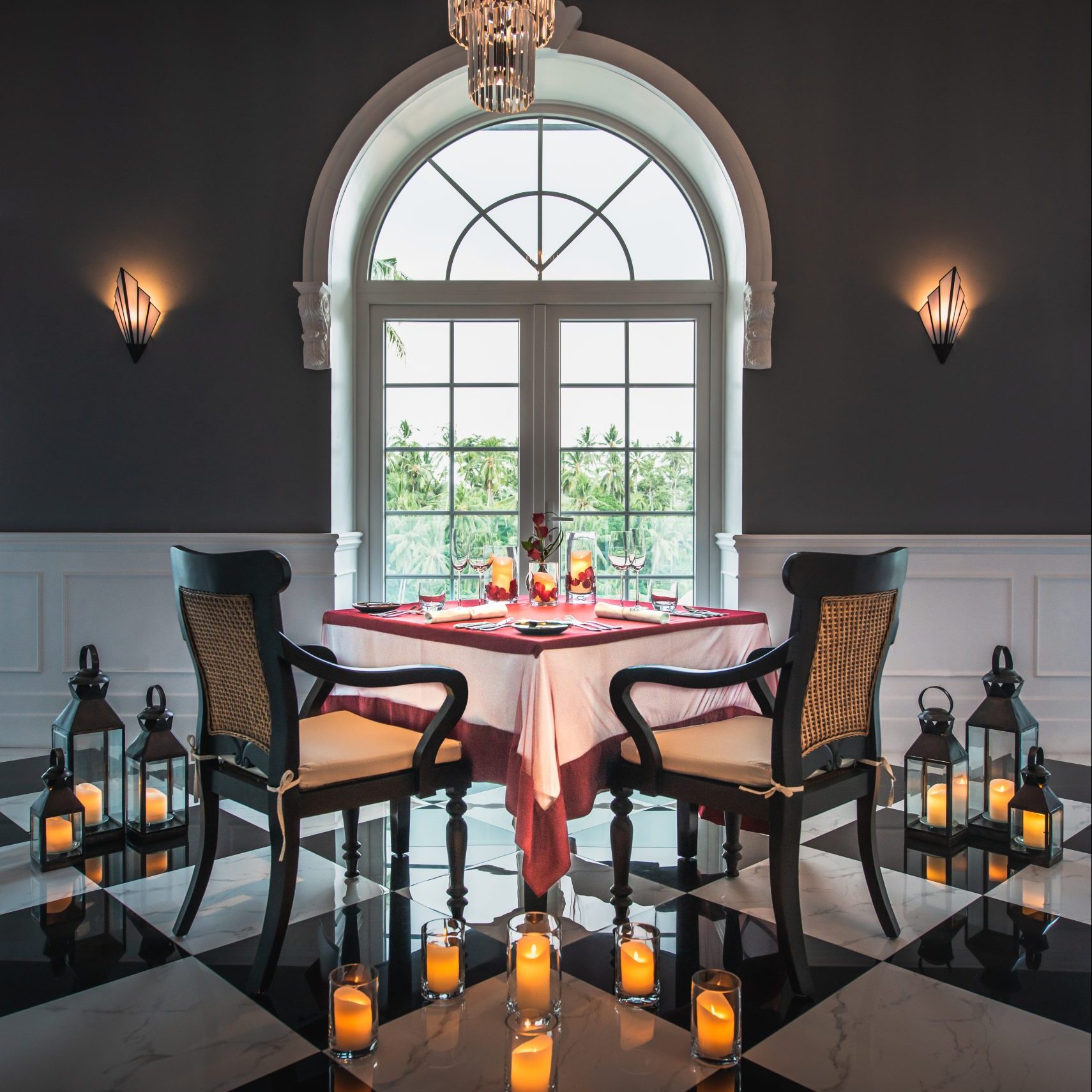 Soft candlelight dances across fine tableware. The warm glow turns each glance into a moment shared. Plush seating, well-spaced tables, and quiet exclusivity create the perfect space for your hush-hush conversations. The grand dining hall, wrapped in vintage charm, feels both elegant and inviting.